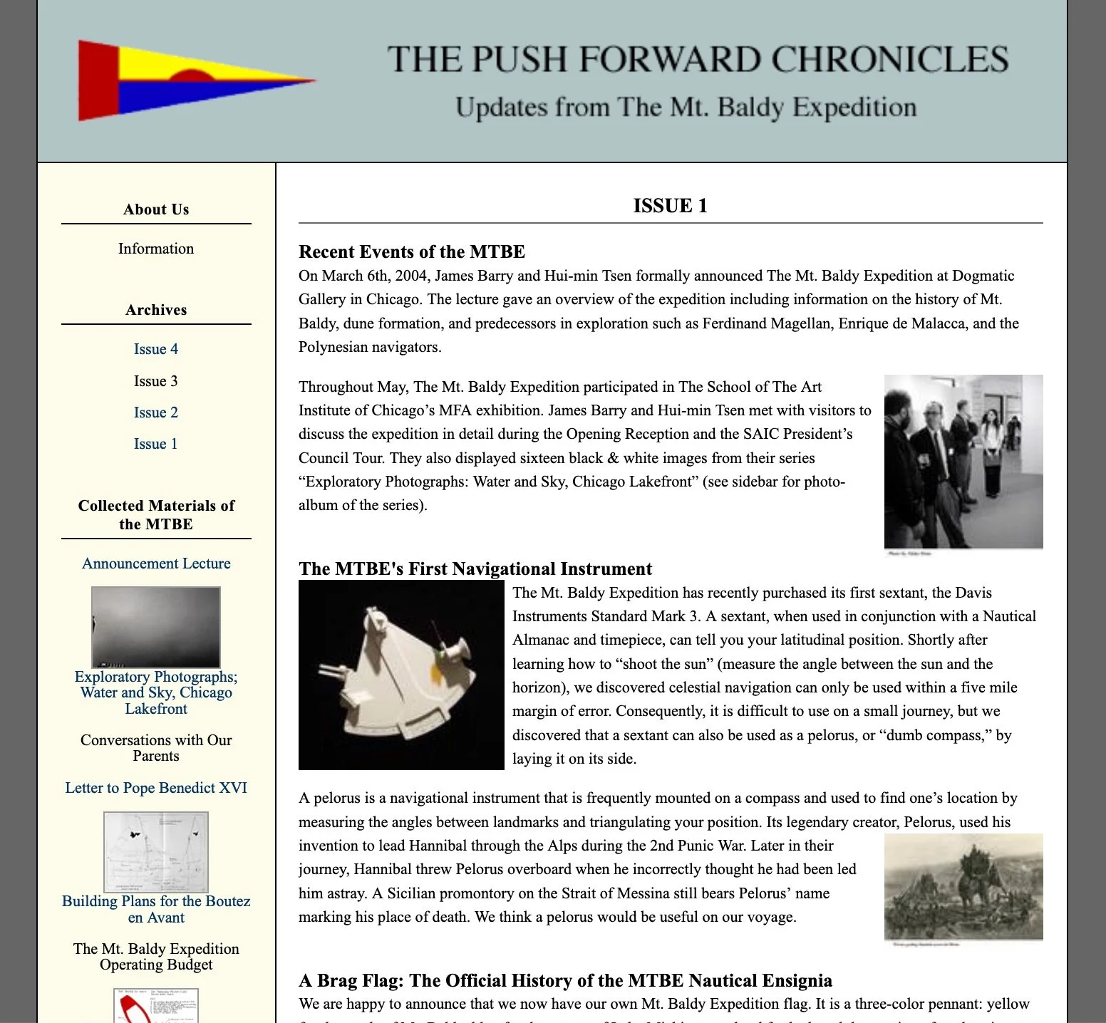 On March 6th, 2004, James Barry and Hui-min Tsen formally announced The Mt. Baldy Expedition at Dogmatic Gallery in Chicago. The lecture gave an overview of the expedition including information on the history of Mt. Baldy, dune formation, and predecessors in exploration such as Ferdinand Magellan, Enrique de Malacca, and the Polynesian navigators.