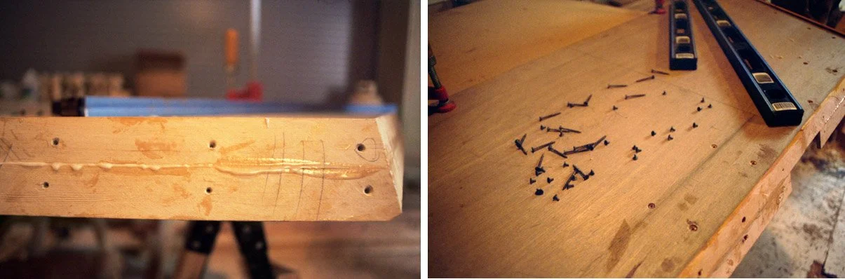 As a quick solution to save time and materials, we enlarged the transom's edges by gluing a bit of Douglas-fir to the sides that came up short and temporarily fixed them in place with some dry wall screws while the epoxy set. The plan was to take out the screws and re-plane the transoms down to the correct angle. We learned a lesson in epoxy, though. When we went to take the screws out, we found the epoxy had grabbed them like a vise. About 80% of the screwheads snapped off, and we realized we'd have to rebuild the transoms from scratch. The markings on the transom where the screws didn't come out (below left) and the broken screws (below right).
