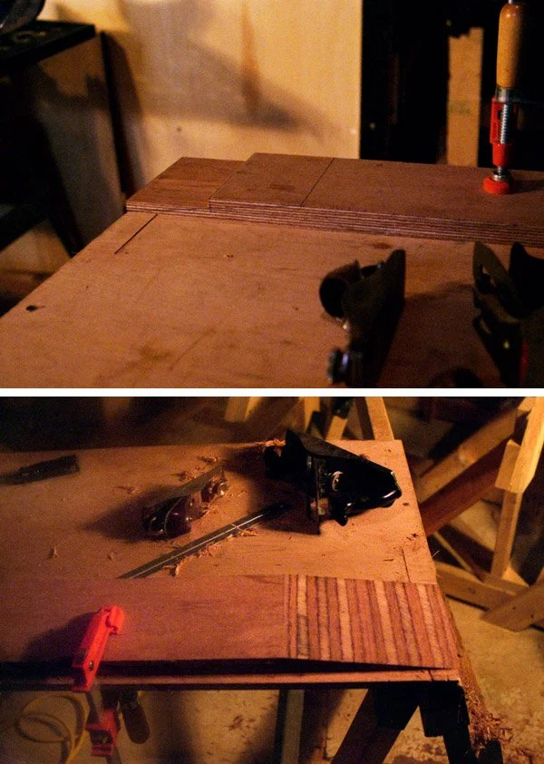 The keelson consists of two pieces of ½ inch Meranti plywood measuring 6" wide and 10' 6" long. These pieces are bent over the strongback and laminated together. Our plywood, however, came in 4'x8' sheets. To make the 10' 6" length that we needed required us to join two shorter pieces end to end using a scarf joint, one of the most common forms of joinery in boat building. First, we marked the 8:1 angle on the two pieces we were joining (left top), and then made the bevel cut, maximizing the adherable surface area (left bottom) to create a strong and bendable bond. We cut them together to ensure an exact fit using a power plane for the rough work then a hand plane for the exact angle.