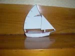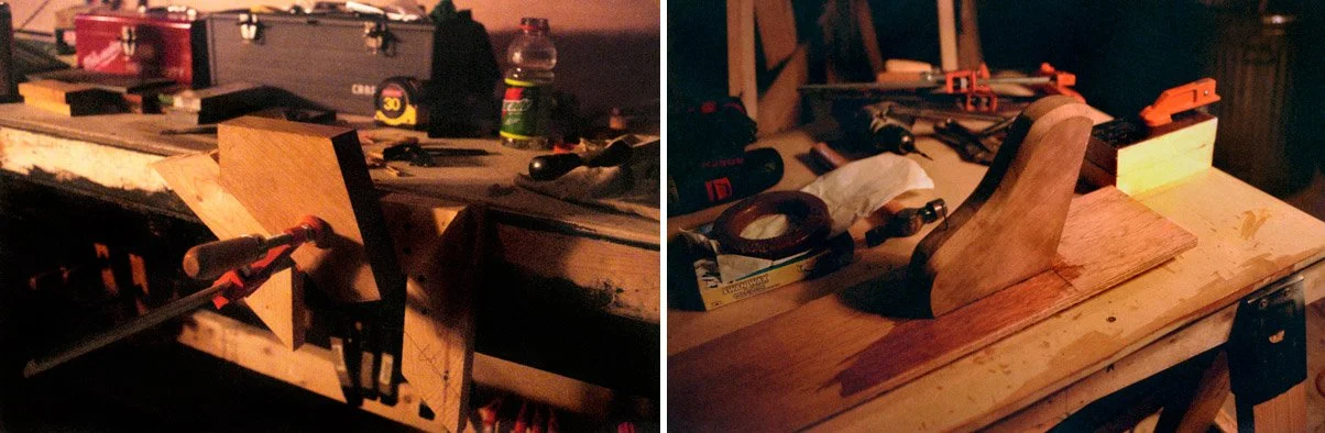 To make the transoms, we carefully followed the dimensions and angles specified in Captain Short's plans. First we enlarged and transposed the pattern from the plans to the plywood and cut them out (far left). We then planed down the edges that were left rough from the cut (above right).