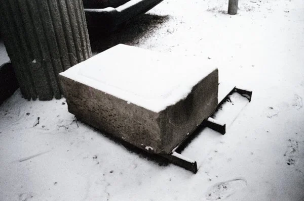 At the end of January an "Alberta Clipper" (also known as a "Saskatchewan Screamer") blew in a mass of cold, dry air bringing temperatures in the single digits and creating some challenging work conditions. The next few weeks had an average temperature of only 4.4 degrees making this Chicago's coldest February in 112 years. By mid-February, however, snow came with slightly warmer temperatures. At right, the former cornerstone to the New Salem First Evangelical Church and the current MTBE Boat Works' break area early in February.